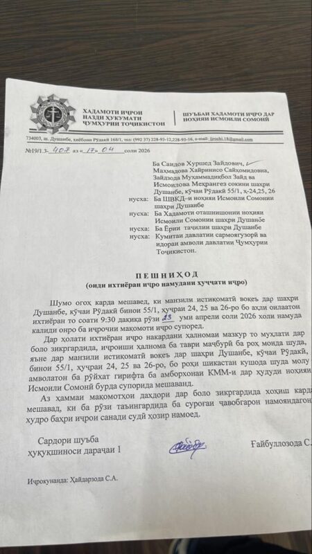 Тибқи санаде, ки аз ҷониби Хадамоти иҷрои назди Ҳукумати Ҷумҳурии Тоҷикистон (шуъбаи ноҳияи Исмоили Сомонӣ) содир шудааст, қарор аст манзили воқеъ дар шаҳри Душанбе, кӯчаи Рӯдакӣ 55/1, ҳуҷраи 24, ки дар он чанд оилаи вобаста ба Саидов зиндагӣ мекунанд, ба иҷрои маҷбурии ҳукми додгоҳ кашида шавад. Дар ҳуҷҷат зикр шудааст, ки сокинон бояд то 25 апрели соли 2026 манзилро холӣ кунанд, дар акси ҳол, ихроҷи маҷбурӣ бо ҷалби мақомоти дахлдор анҷом дода мешавад.